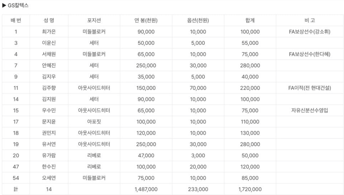 GS칼텍스배구단 선수등록 및 연봉