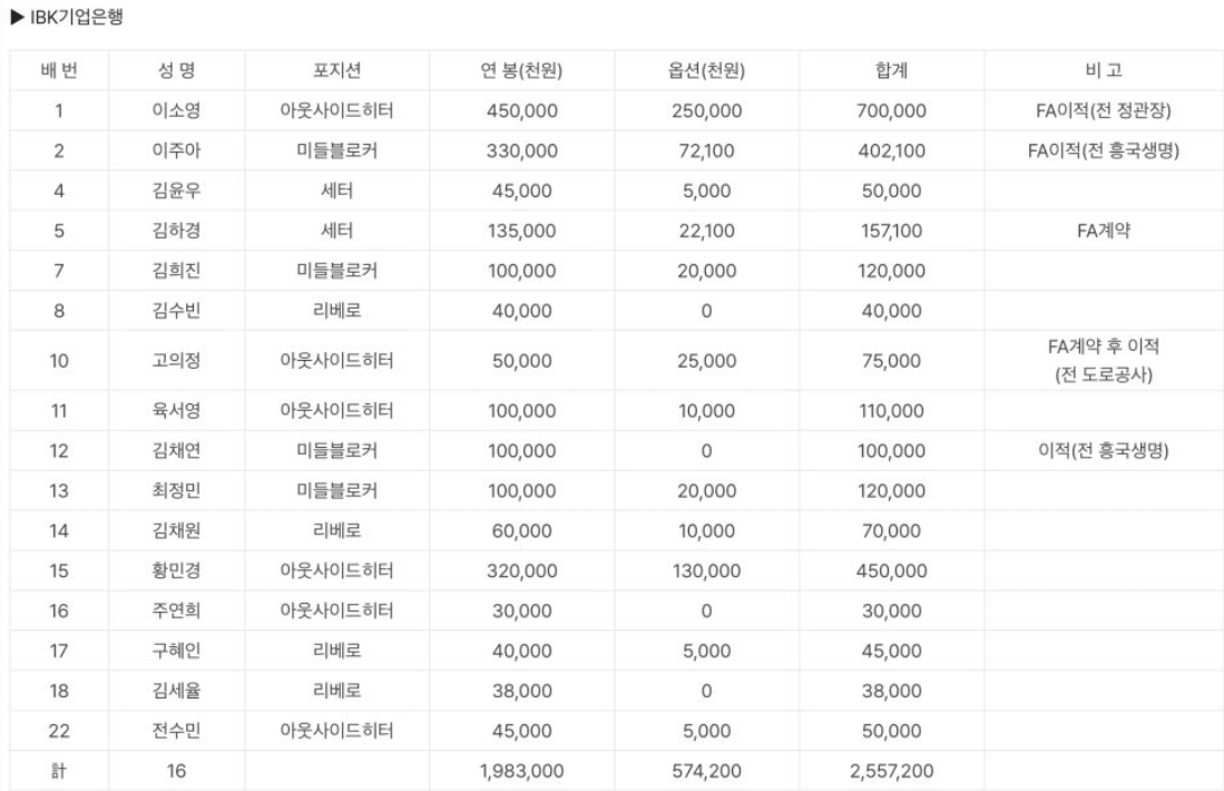 24-25시즌 IBK기업은행배구단은 FA계약 1명, FA이적 2명, 트레이드2명 총 16명이 1차 선수 등록 완료했습니다. 이번 시즌 IBK기업은행 연봉 총액은 25억 5천7백20만원이고 배구단 내 연봉 탑5는 이소영, 황민경, 이주아, 김하경, 김희진, 최정민입니다.