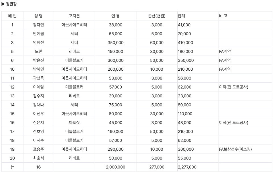 24-25시즌 정관장배구단은 FA계약 3명, 트레이드 2명, FA보상선수 1명 포함 16명이 1차 등록을 완료했습니다. 이번 시즌 정관장배구단 연봉 총액은 22억 7천 7백만원이고 배구단 내 연봉 탑5로는 염혜선, 박은진, 표승주, 박혜민, 정호영입니다.