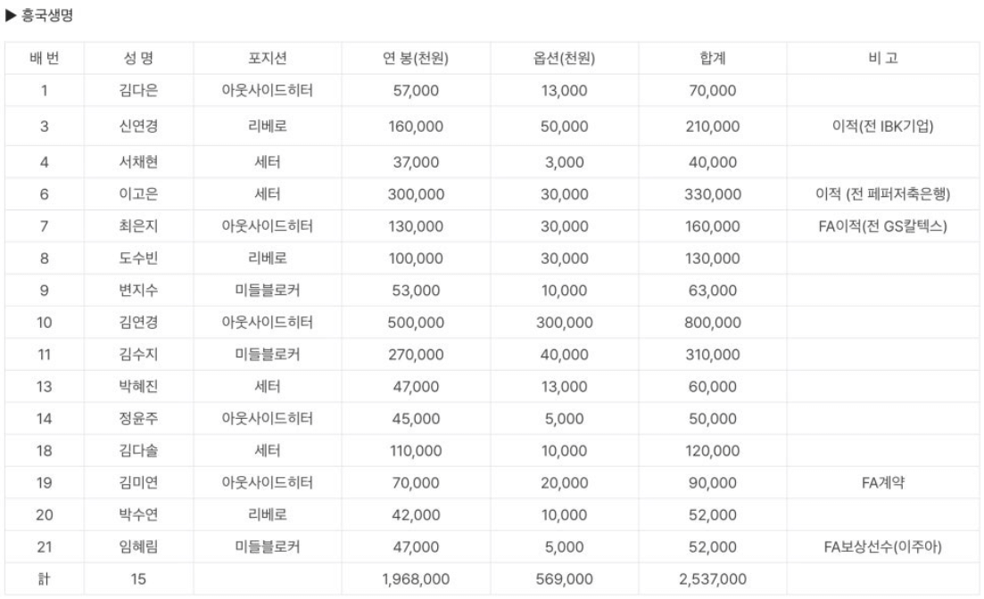 24-25시즌 흥국생명배구단 1차 선수등록 결과 이적 선수 3명, FA계약 1명, FA보상선수 1명 포함 총 15명이 1차 등록됐습니다. 이번 시즌 흥국생명배구단 연봉 총액은 25억 3천7백만원이고 배구단 내 선수 연봉 탑 5에는 김연경, 이고은, 김수지, 신연경, 최은지입니다.