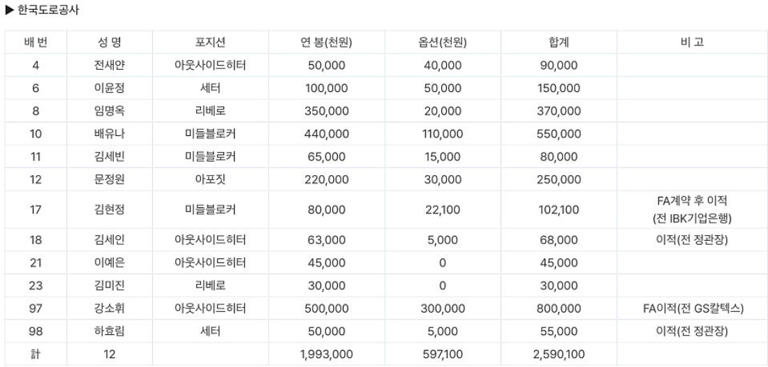 24-25시즌 한국도로공사배구단은 FA이적 1명, 트레이드 3명으로 총 12명이 1차 선수등록을 완료했습니다. 이번시즌 한국도로공사배구단 연봉 총액은 25억 9천10만원이고 1차 선수 등록 수는 가장 적지만 연봉 총액은 가장 많은 구단입니다. 배구단 내 연봉 탑5는 강소휘, 배유나, 임명옥, 문정원, 이윤정입니다.