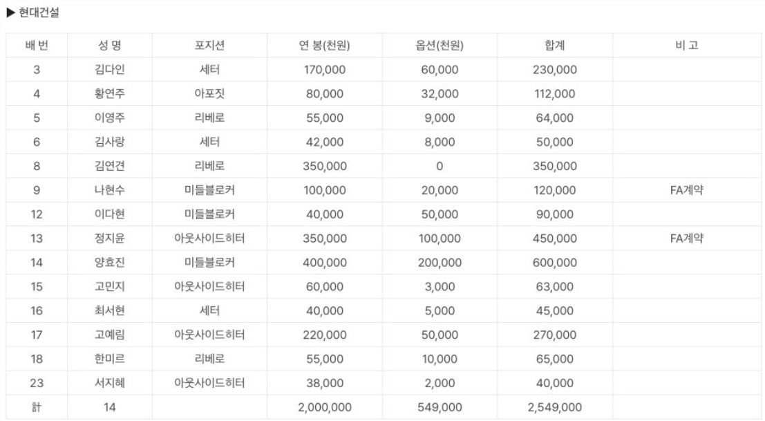 24-25시즌 현대건설배구단 선수들은 기존 선수가 FA 계약을 하면서 현재 총 14명입니다. 이번시즌 현대건설배구단 총 연봉액은 25억 4천9백만원이고 배구단 내 연봉 탑 5로는 양효진, 정지윤, 김연견, 고예림, 김다인인데요. 현대건설배구단은 아직까지는 새로운 선수영입이 없는 기존 선수들 그대로인 유일한 배구단으로 지난 시즌처럼 단합된 팀 모습을 보여줄 것이라 예상하고 있습니다.
