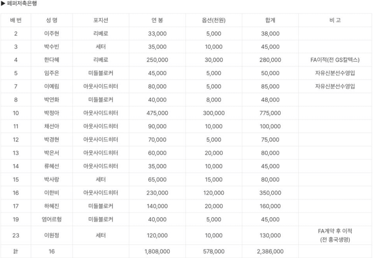 24-25시즌 페퍼저축은행배구단은 FA이적 1명, 트레이드 1명, 자유선수 영입 2명으로 총 16명이 1차 선수등록을 마쳤습니다. 이번 시즌 페퍼저축은행 배구단 연봉 총액은 23억 8천6백만원이고 배구단 내 선수 연봉 탑 5로는 박정아, 이한비, 한다혜, 하혜진, 이원정입니다.